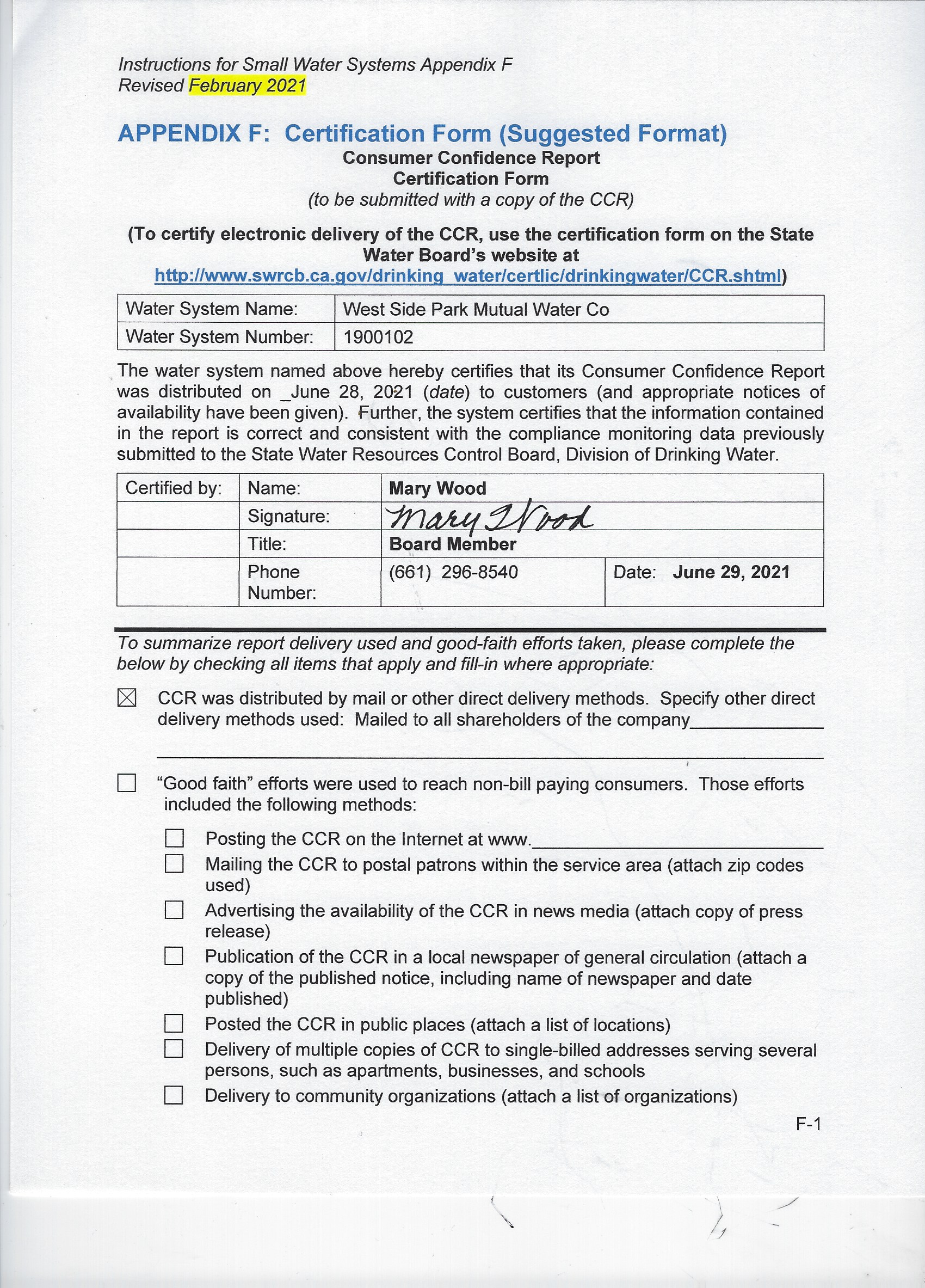WESTSIDE PARK MUTUAL WATER |
