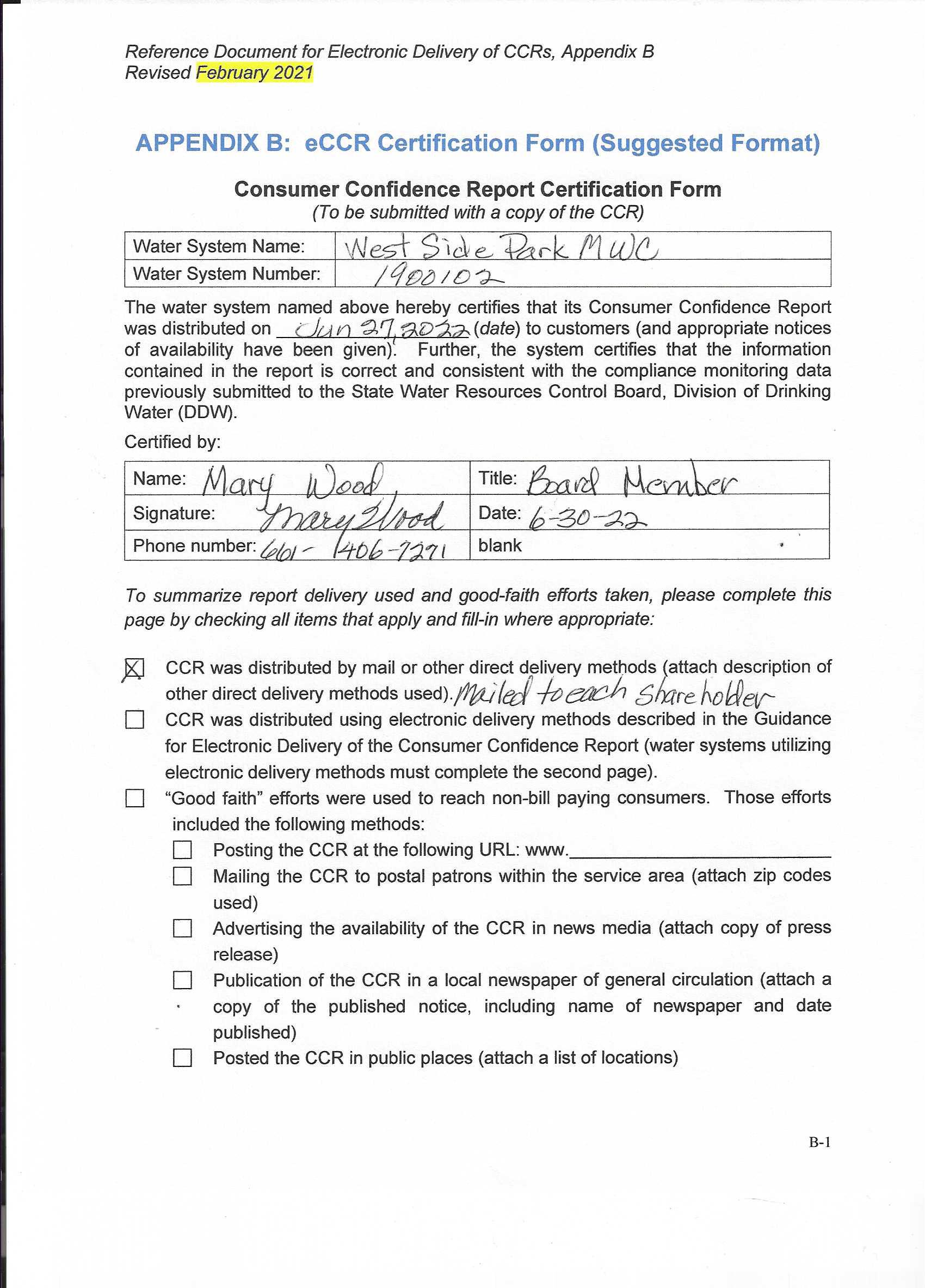 WESTSIDE PARK MUTUAL WATER |